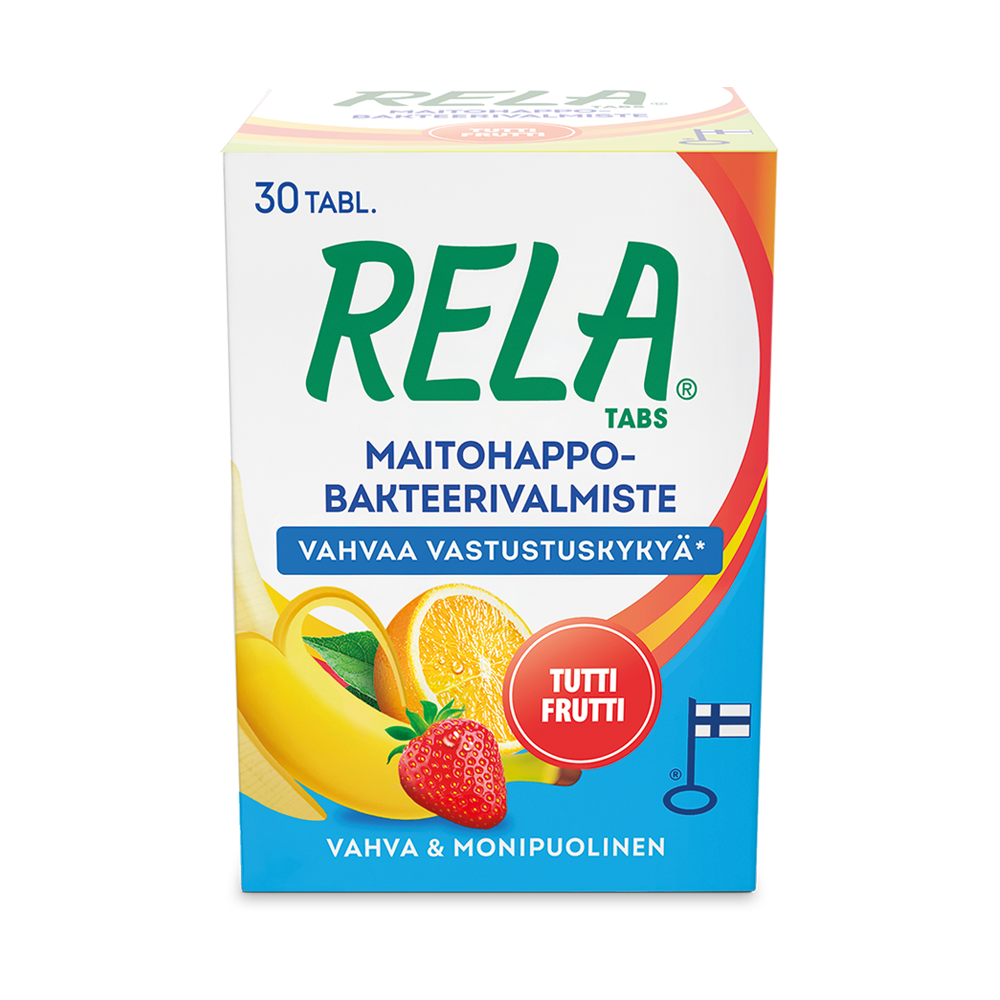Rela Tabs Tutti Frutti on hyvänmakuinen, sokeriton purutabletti, joka yhdistää tehokkaat maitohappobakteerit ja vastustuskykyä tukevan C-vitamiinin. Päivittäiseen käyttöön sopiva ravintolisä sisältää kaksi tutkitusti turvallista ja laadukasta maitohappobakteerikantaa: Lacticaseibacillus rhamnosus SP1 ja Bifidobacterium lactis BLC.