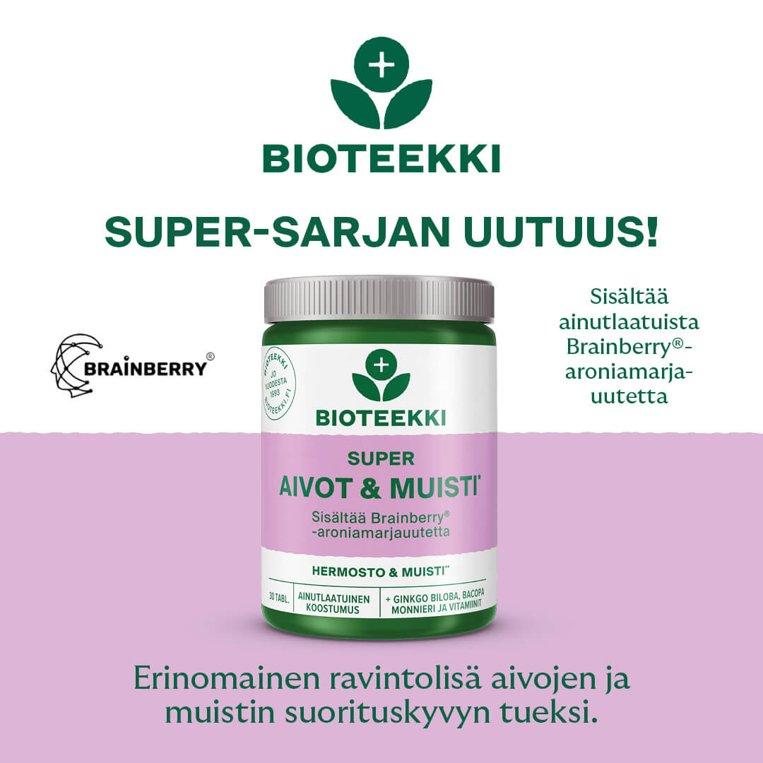 Bioteekin Super Aivot & Muisti sisältää patentoitua, kliinisesti tutkittua Brainberry®-aroniamarjauutetta sekä aivojen ja muistin toimintaa tukevaa Bakopauutetta. Valmisteen sisältämä neidonhiuspuu-uute (Ginkgo Biloba) tukee kognitiivisia toimintoja, kun taas B6-, B12- ja C-vitamiini tukevat psykologisia toimintoja ja hermoston normaalia toimintaa.