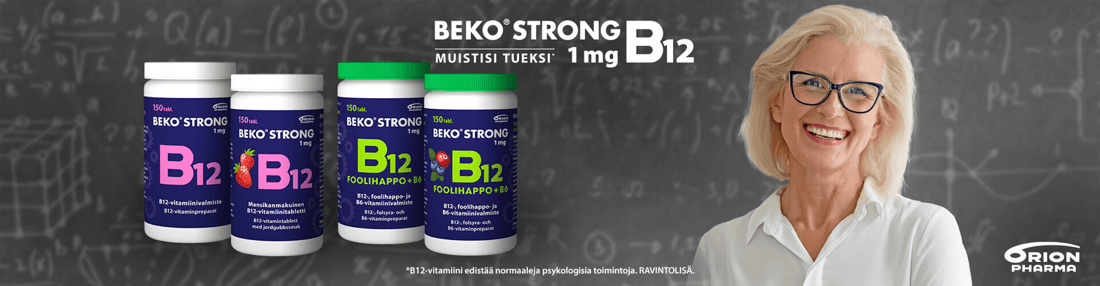 - Beko Strong B12 1mg: Tehokas B12-vitamiinilisä, joka auttaa vähentämään väsymystä ja uupumusta sekä tukee normaalia energia-aineenvaihduntaa.