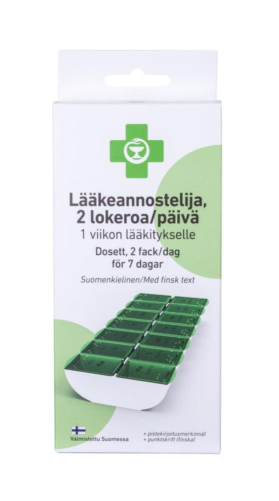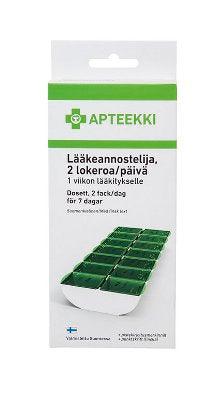 APTEEKKI-dosett med 2 fack per dag för att underlätta skiljandet mellan morgon- och kvällsmedicinerna. Avsedd för en veckas medicinmängd. Tillverkad i Finland.