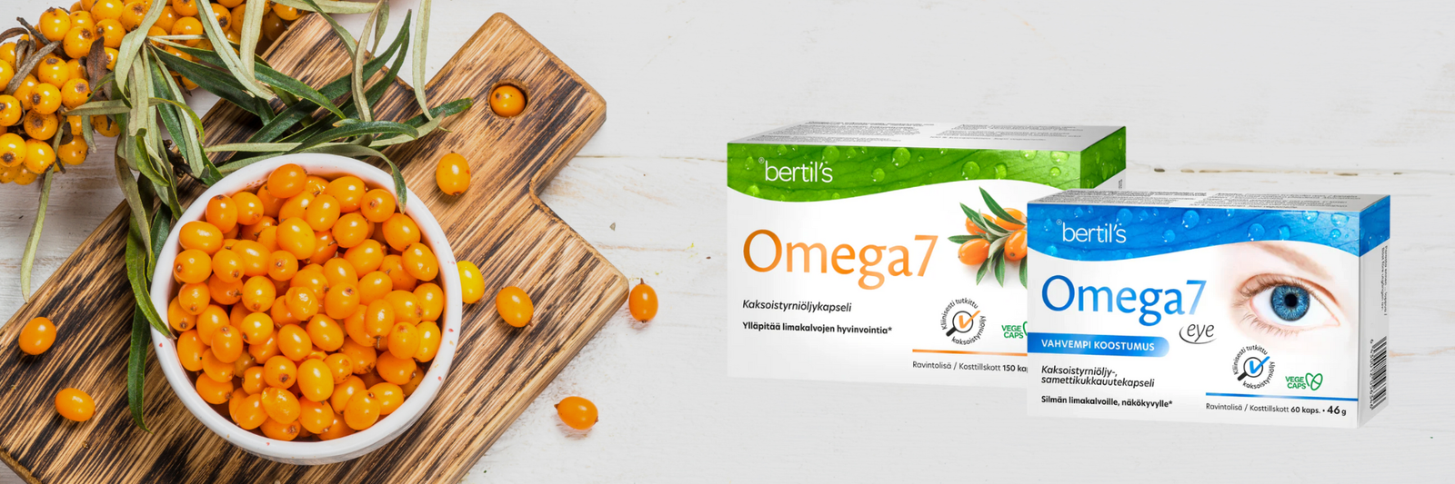 Bertil’s Omega7 -sarja tarjoaa korkealaatuiset Omega7 kaksoistyrniöljykapselit, jotka ovat suunniteltu tukemaan ihon ja limakalvojen hyvinvointia luonnollisesti. Jokainen tuote sisältää tarkoin valmistettua kaksoistyrniöljyä, joka yhdistää tyrnimarjan siemenöljyn ja hedelmälihan öljyt – näin hyödyt säilyvät täysinä ja tasapainoisina.
