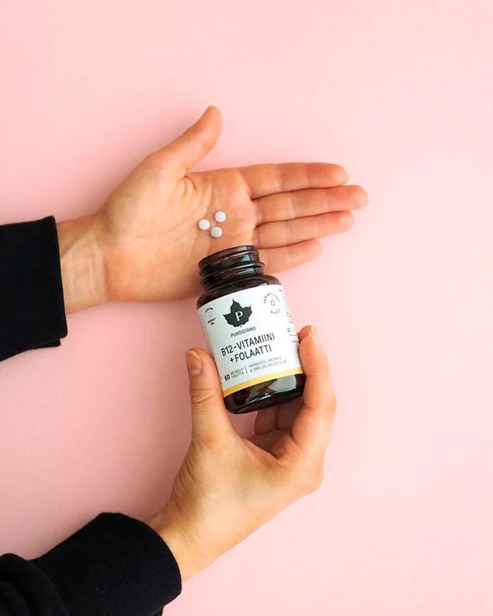 Puhdistamon B12 + Folaatti on vadelmanmakuinen, vegaaninen imeskelytabletti, joka sisältää B12-vitamiinin ja Quatrefolic®-folaatin aktiiviset muodot. Tuote tukee hermoston normaalia toimintaa, energia-aineenvaihduntaa sekä immuunijärjestelmän toimintaa. Lisäksi B12-vitamiini ja folaatti auttavat vähentämään väsymystä ja uupumusta.